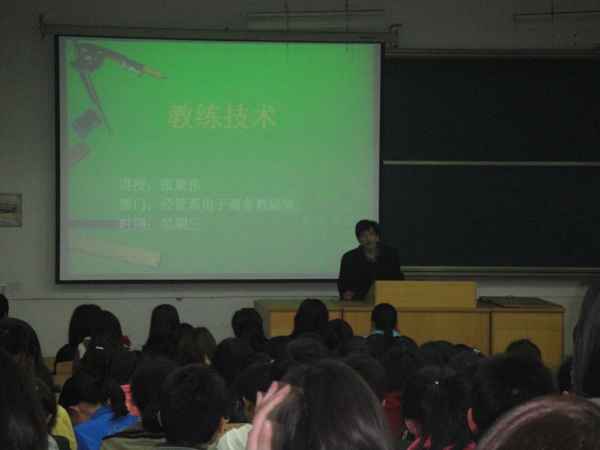 2010年4月21日,电子商务教研室张聚伟老师举办了主题为“教练技术”的科普讲座。讲座从倾听、发问、沟通等多个角度讲解了教练技术的深刻含义,以及现代社会企业管理、日常生活中教练技术的应用,和带来的良好效果。通过本次讲座,学生感觉受益匪浅,并产生浓厚兴趣,在当天的晚自习上依然与张老师探讨教练技术的运用技巧。