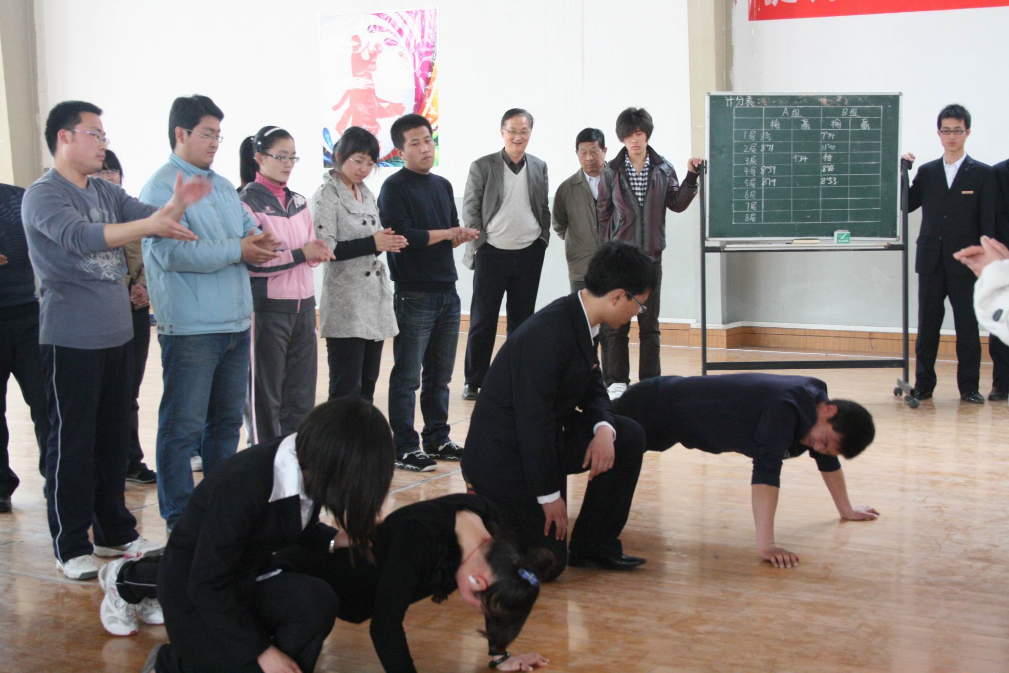 活动共分三部分,第一部分是集体跳“兔子舞”,一则是让紧张忙碌的老师放松心情,全身投入,二则是为后面的活动进行热身。此“兔子舞”的寓意是“团队步伐一致”才能快速前进。第二部分是“领袖风采”,公平分组进行胜负对决,队长承担队员所犯的错误,接受惩罚。此活动让大家切身体会到了责任的重要性。第三部分是“穿越电网”,在活动过程中要求所有队员以“团队”为荣,严谨、自律、坚持,注意细节,不能因个人而让整个团队成员做无谓的牺牲。团队成员只有齐心协力、不畏艰难、才能攻克难关,取得胜利。