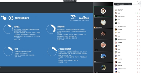 三家企业的招聘负责人分别从公司的发展历程规章制度、薪资待遇及应聘者的具体要求和发展通道进行了讲解,并结合内部员工的工作经历与同学们分享了经验与心得通过腾讯会议线上会议的的方式,招聘负责人与应届毕业生进行交流与沟通,同时对于同学们提出的疑问,招聘负责人进行相应的讲解。