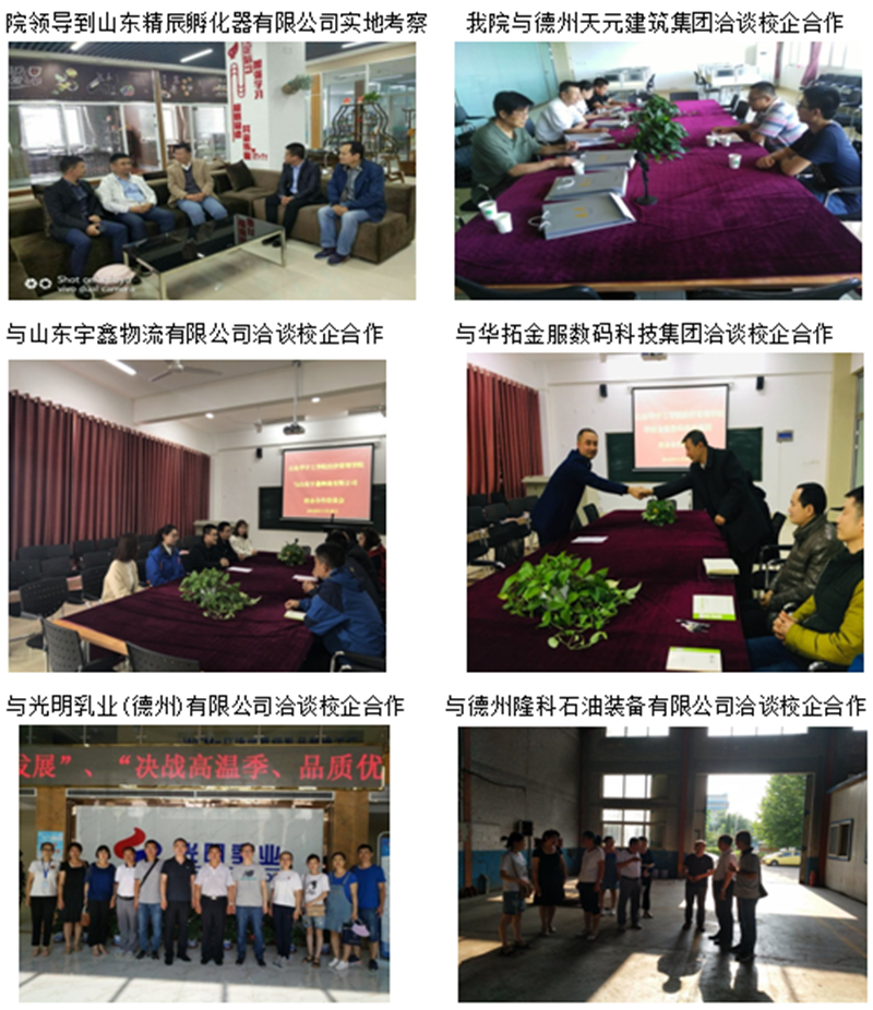目前学院校企合作工作已经取得阶段性的成果,物流工程专业先后与山东佳怡国际汽车物流有限公司、百世物流科技公司、九州通医药物流有限公司、山东枣粮先生科技有限公司、家宜物流集团五家企业达成学生实习基地合作协议;会计专业先后与中国建行德州分行、精辰孵化器有限公司(代理记账公司)、泰康人寿保险公司、德州天元集团公司、北京华拓金服数码科技集团有限公司、山东宇鑫物流有限公司六家企业达成共建实习基地和就业基地的合作协议;工业工程、信息管理与信息系统、房地产开发与管理专业分别于德州隆科石油设备有限公司、德州速启网络技术有限公司、德州精益管理信息咨询有限公司、德州天元建筑集团、山东家大集团达成共建实习基地和就业合作协议;在“共建实验室”、合作育人“共建专业”项目上,会计、物流管理、市场营销、人力资源管理专业与中国建行德州分行、山东宇鑫物流有限公司、北京华拓金服数码科技集团有限公司三家企业达成了合作意向;电子商务专业与山东网商集团在合作育人“共建专业”工作过程中,不断完善了人才培养内容。