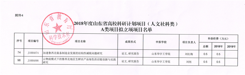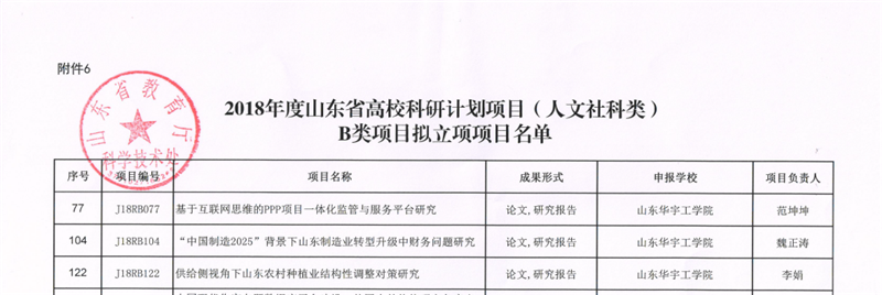 在获批项目中,刘红梅老师主持的《加速鲁西北装备制造业发展的结构性减税问题研究》、刘旭老师主持的《云物流模式下的鲁西北地区生鲜农产品绿色供应链创新与实践研究》被列入人文社科资助类项目,分别获得经费资助0.5万元。魏正涛老师主持的《“中国制造2025”背景下山东制造业转型升级中财务问题研究》、李娟老师主持的《供给侧视角下山东农村种植业结构性调整对策研究》、范坤坤老师主持的《基于互联网思维的PPP项目一体化监管与服务平台研究》3项人文社科项目被列入自筹经费计划。