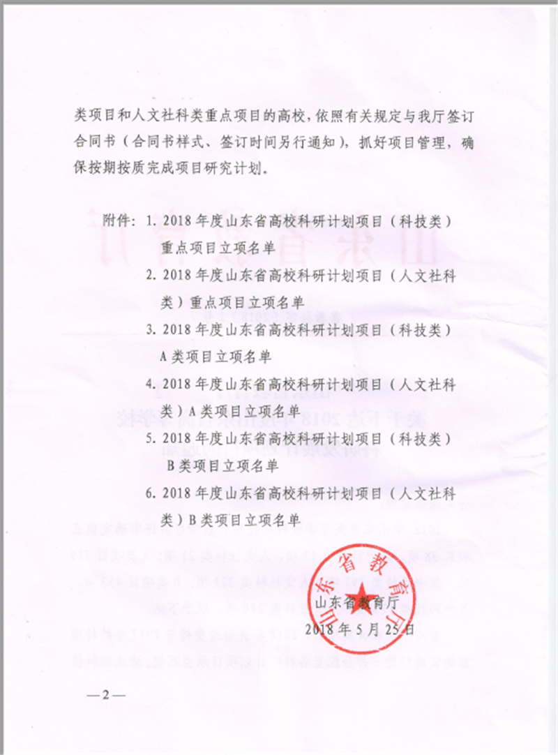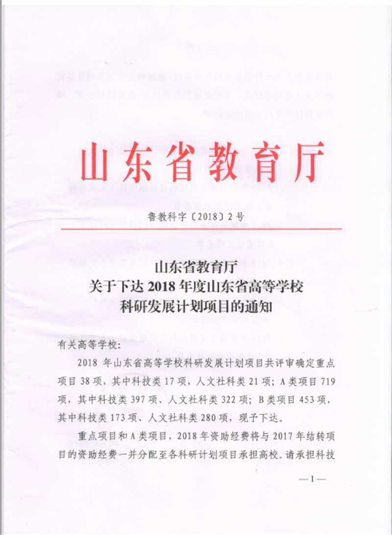 近日,山东省教育厅发布了《山东省教育厅关于下达2018年度山东省高等学校科研发展计划项目的通知》(鲁教科字[2018]2号),新葡萄官网获批5项高等学校科研发展计划项目,有经费资助的A类项目2项,总资助经费1万元,自筹经费B类项目3项。