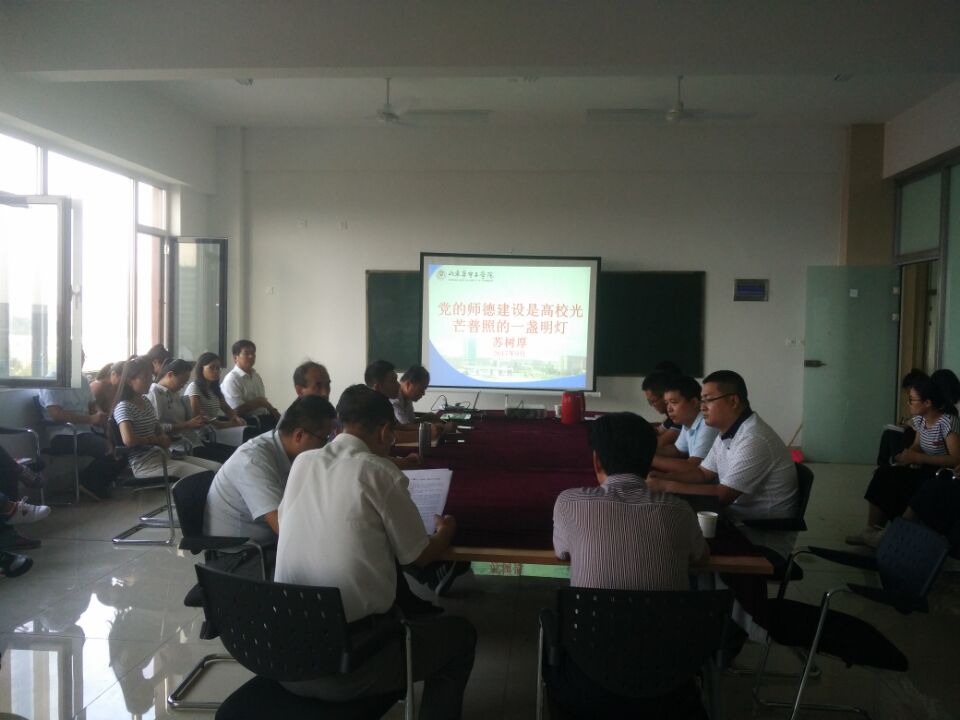 首先,学院邀请了聊城大学知名教授苏树厚为全体教职工作了《党的师德建设是高校光芒普照的一盏明灯》的专题讲座,诠释了高校教师师德建设的地位、目的和内容,以老一代教师的身份告诫了师德养成对教师对学校发展的重要作用,传授了师德养成的方式方法。