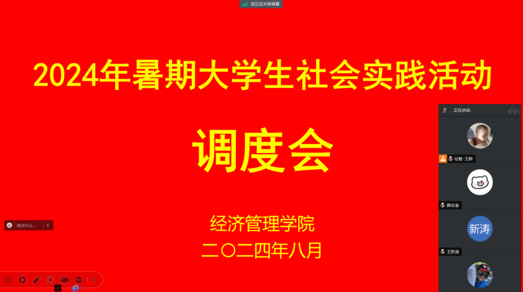 为深入掌握新葡萄官网暑期大学生社会实践活动的开展情况,详细了解实践活动过程中存在的困难和问题,扎实推进新葡萄官网社会实践工作顺利进行,8月6日上午,新葡萄官网通过腾讯会议的形式线上组织召开了2024年暑期大学生社会实践活动开展情况调度会。本次会议由团总支书记王群主持,党总支书记、副院长范世伟以及各团队社会实践指导教师参加了此次会议。